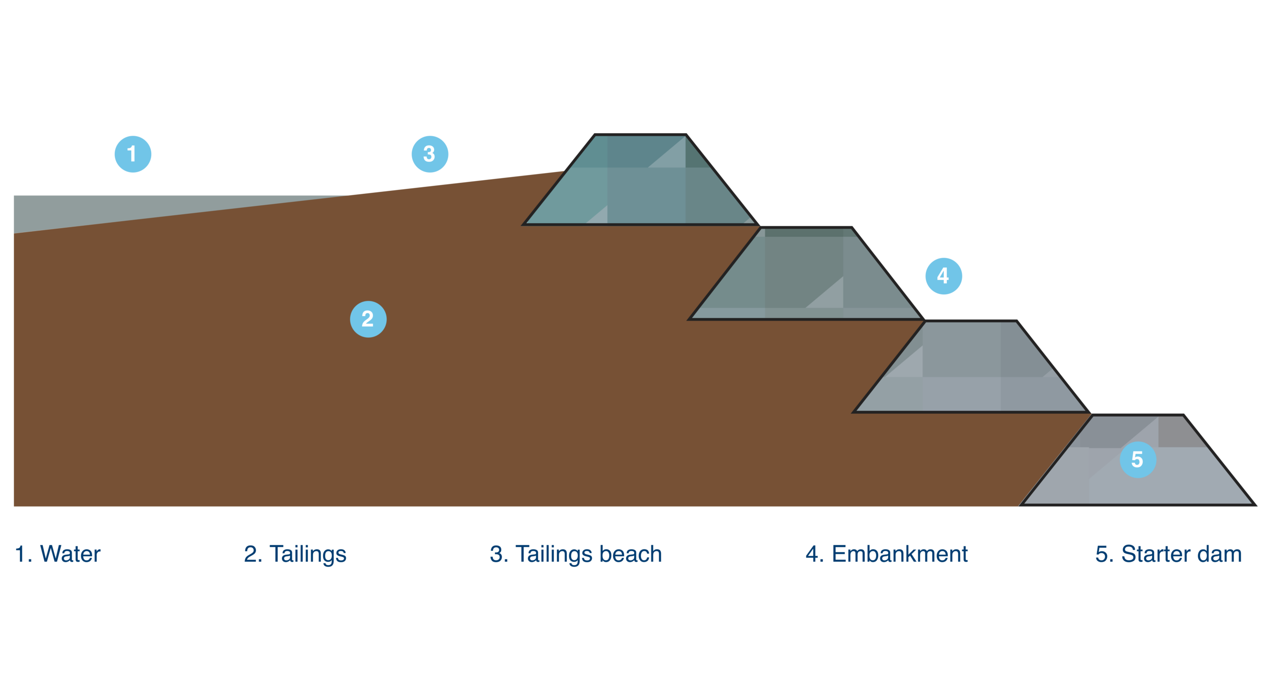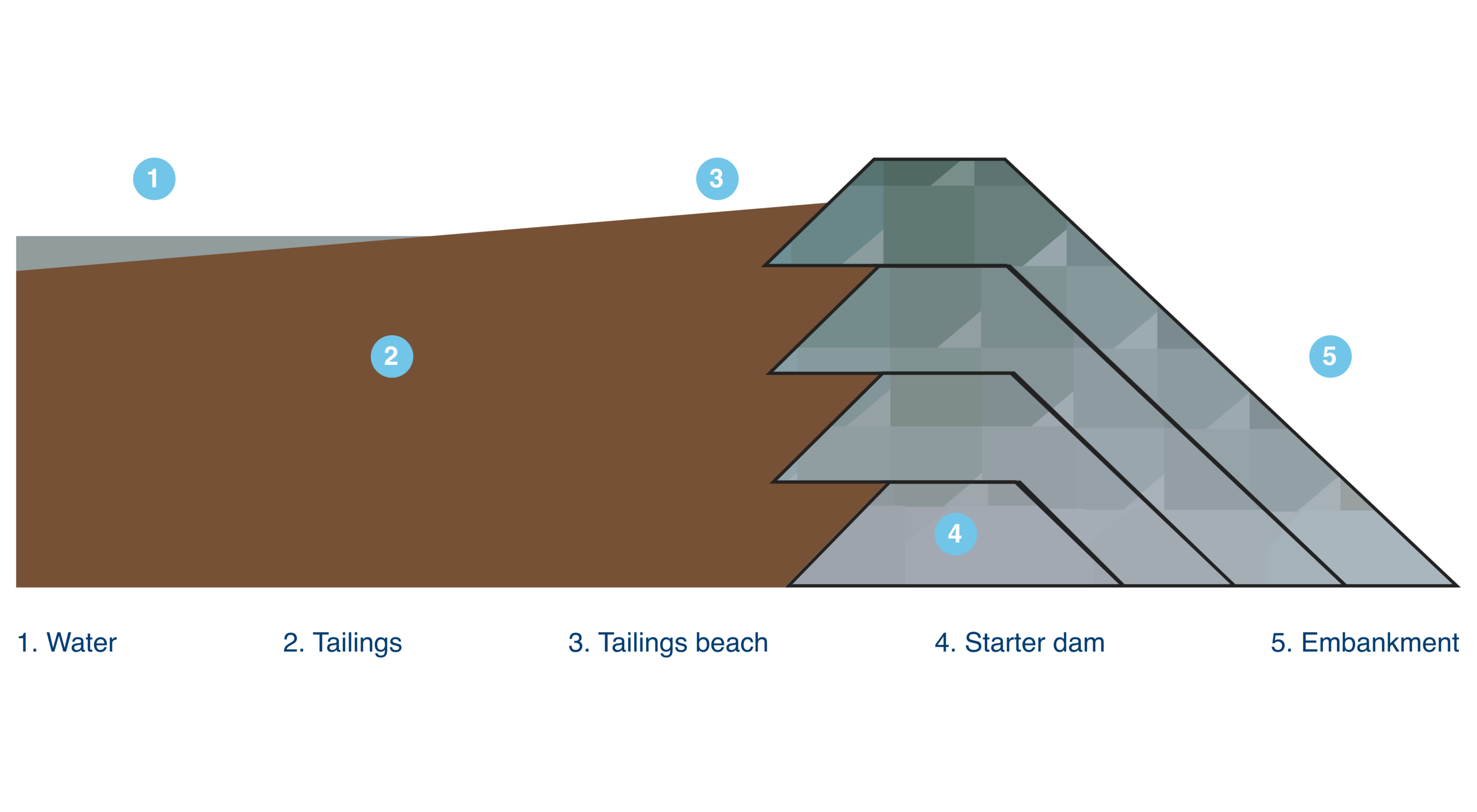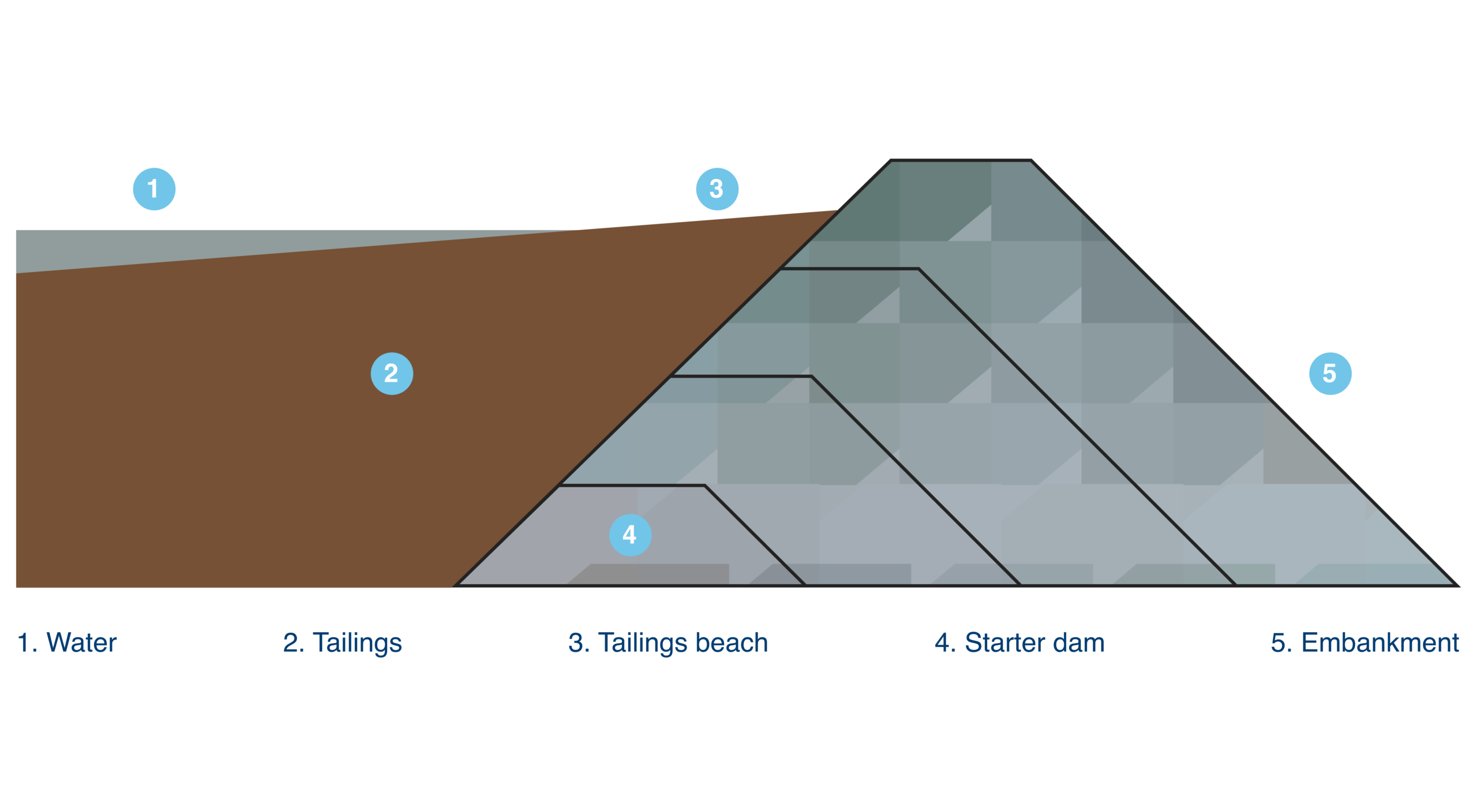 A single stage dam is built to full height in one stage with no further raises. This design is most commonly used for smaller tailings facilities.